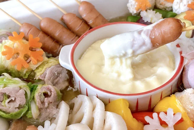 ブロッコリーやウインナー、バゲット、パプリカなど、色とりどりの具材を並べると、テーブルが一気に華やかになります。